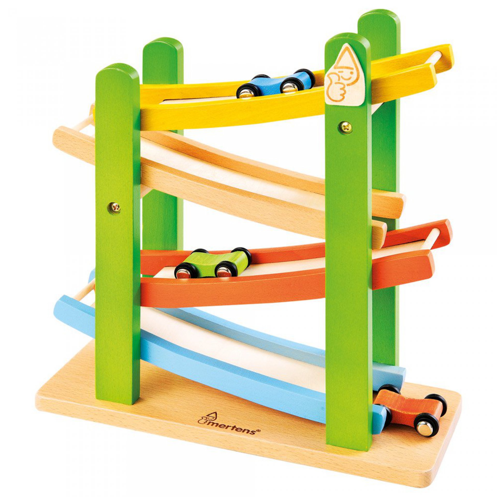 Dřevěná autodráha, která se vejde i do poličky. S barevnou sestavou tří silnicových dílů a tří jednoduchých autíček si užijete spoustu legrace. Stačí se rozjet na nejvyšší části silnice a autíčko samo sjíždí dolů.