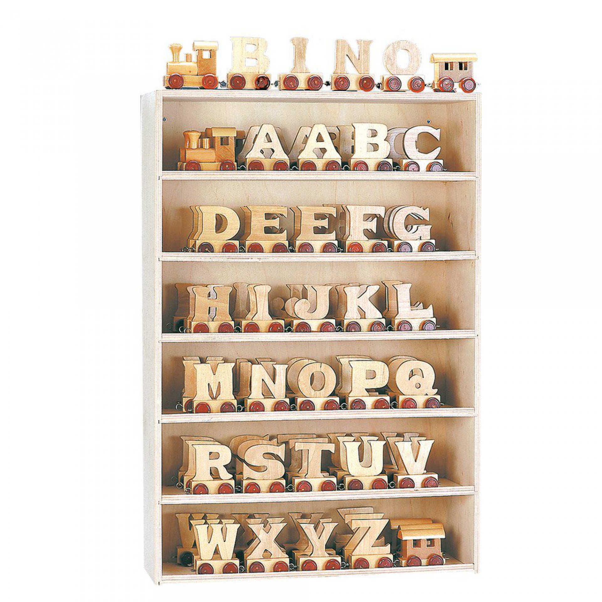 Naučte děti písmenka s dřevěným vláčkem na kolečkách. Kompletní sada obsahuje regálek na vláček, lokomotivu a plnou sadu vagonků s písmeny. Jednotlivé vagonky s písmeny se dají podle potřeby dokoupit.