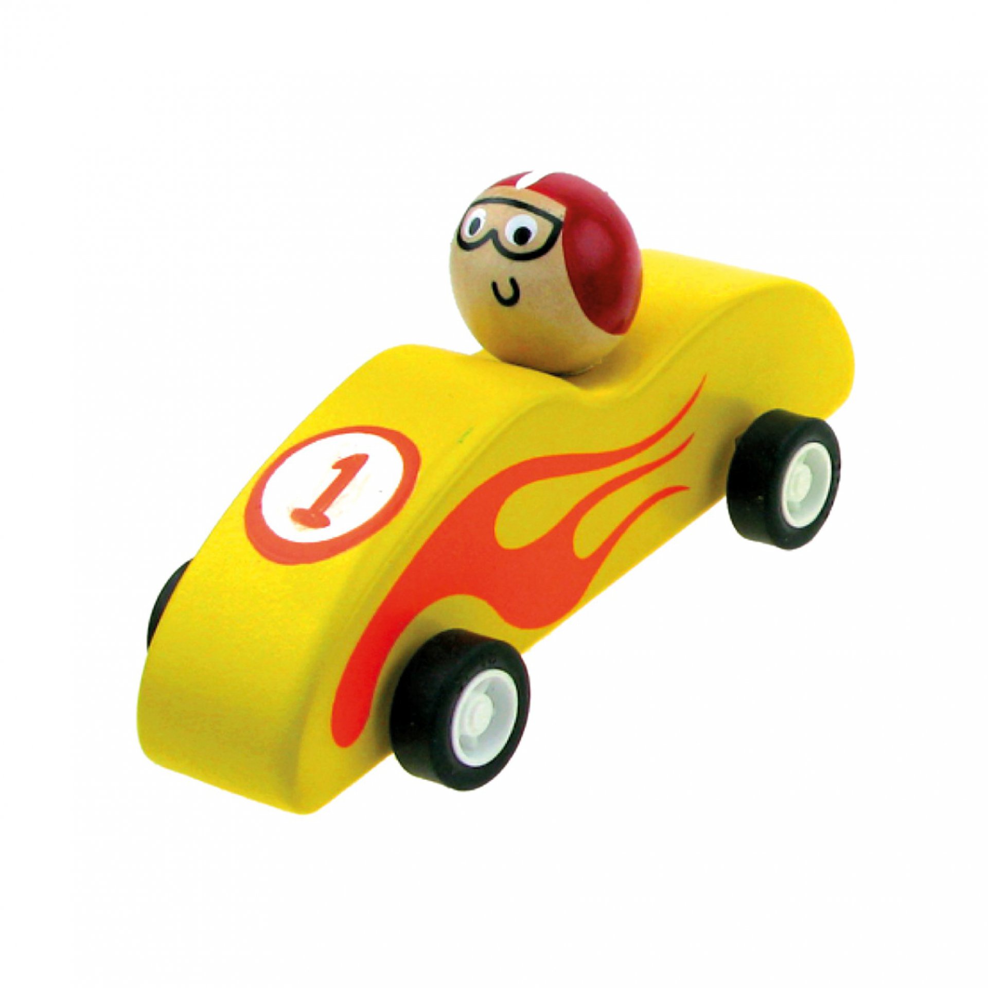 Každý chlapeček má rád auto. A co teprve, když je to přímo formule? Náš usměvavý a odvážný řidič se právě chystá na startovní čáru. Dřevěná, žlutá formule, s ohnivým designem na kapotě je vybavena kvalitním setrvačníkem.