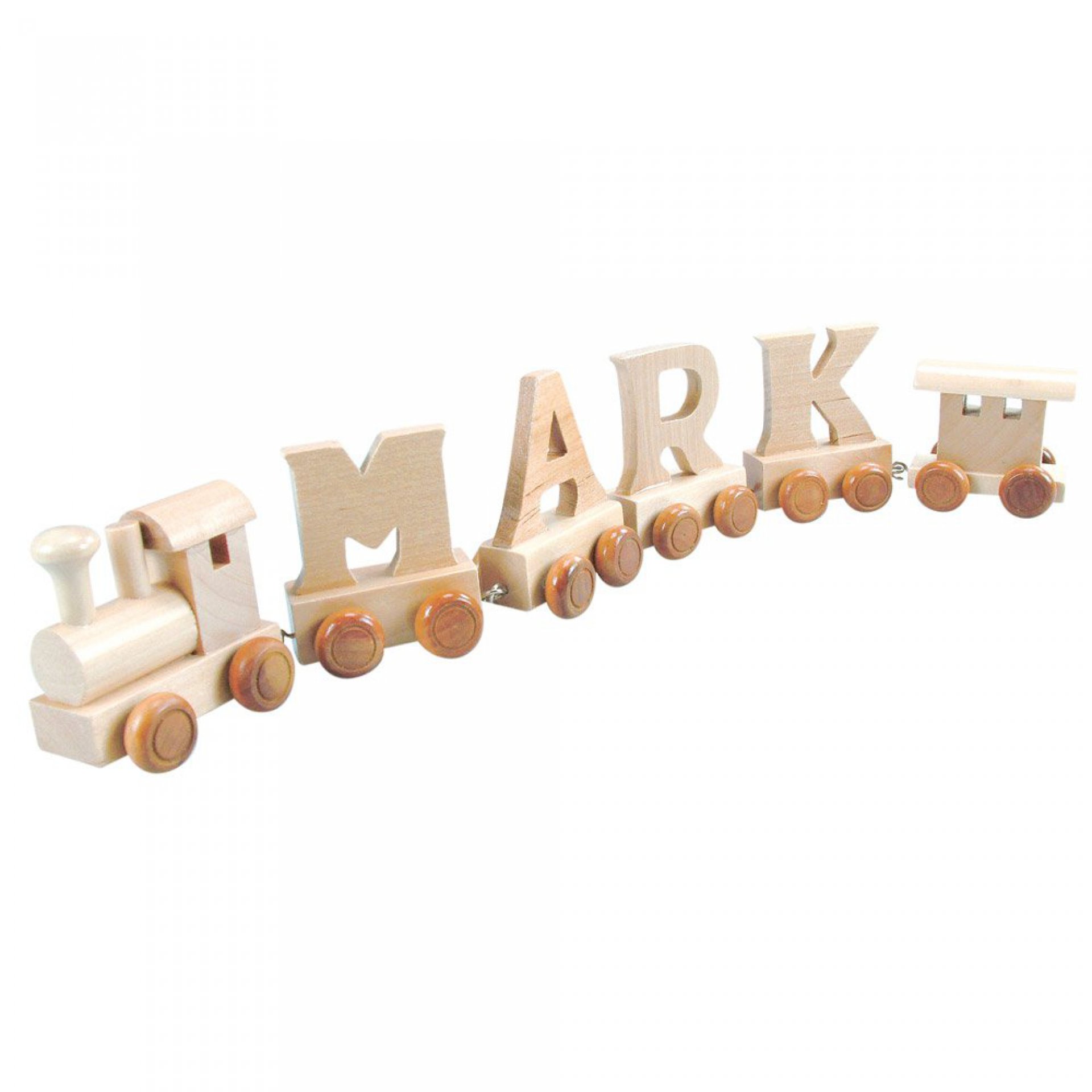 Dřevěná lokomotiva s hnědými kolečky k vláčku s písmeny. Doplňte ji vagónky s písmeny, které už Vaše dítě zná i těmi, se kterými je postupně seznámíte.