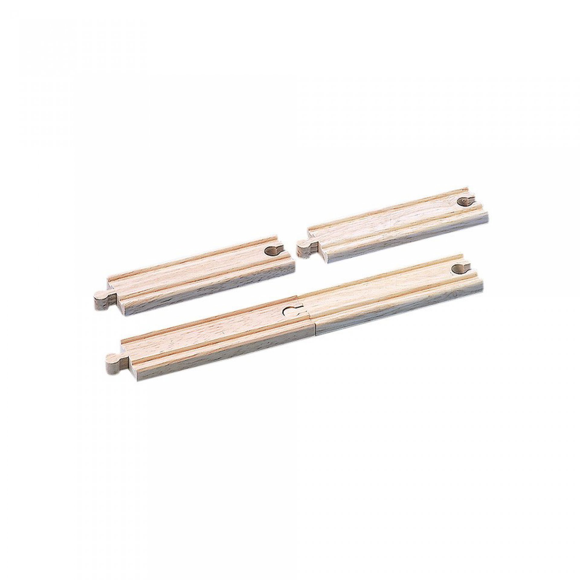 Rovné koleje malé, doplněk dřevěné vláčkodráhy v balení po čtyřech kusech, rozměry: 45,5x4x1,2 cm.