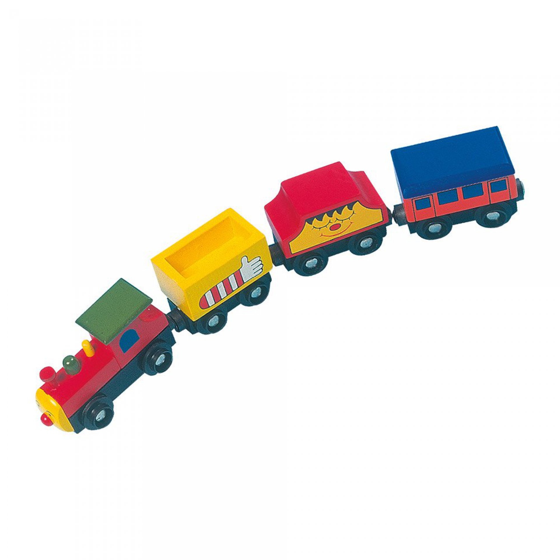 Dřevěný vláček s lokomotivou a třemi vagónky ve veselých barvách k dřevěné vláčkodráze. Jednotlivé díly jsou spojené magnety, délka soupravy 31 cm.