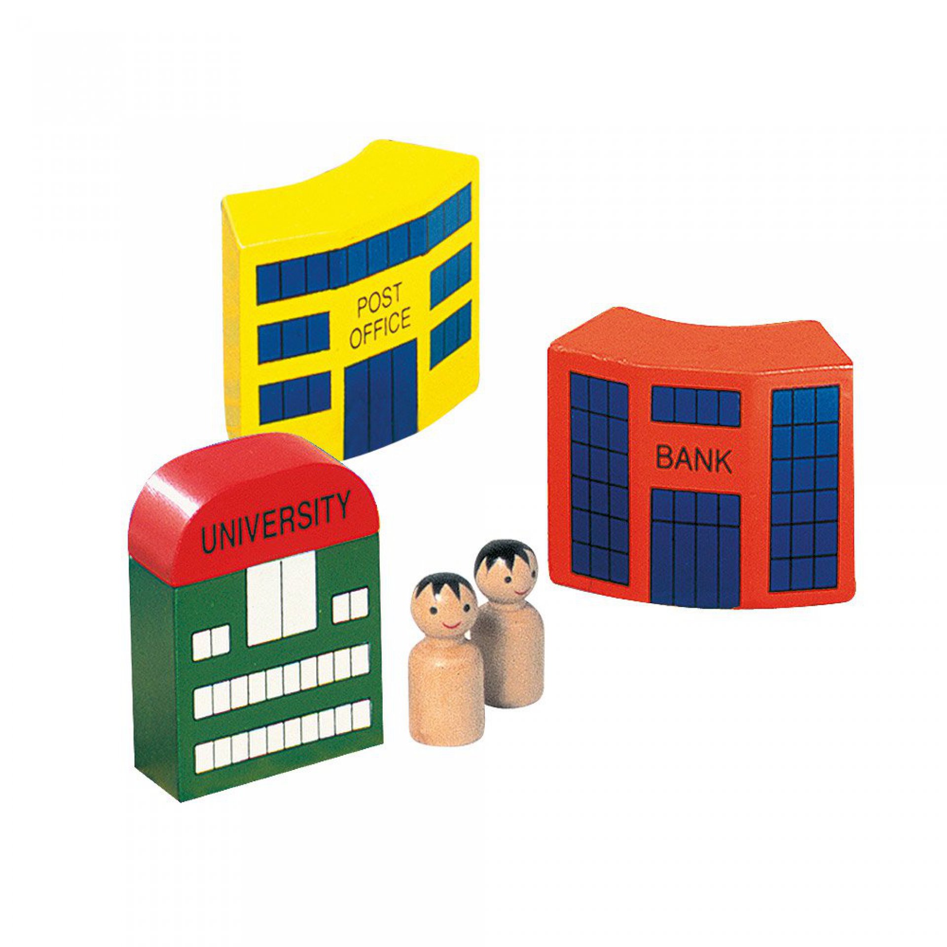 Dřevěné barevné městečko se dvěma figurkami je určeno jako doplněk vláčkodráhy, lze jej však uplatnit i samostatně. 5 kusů v balení, rozměry: 40x4x16 cm.