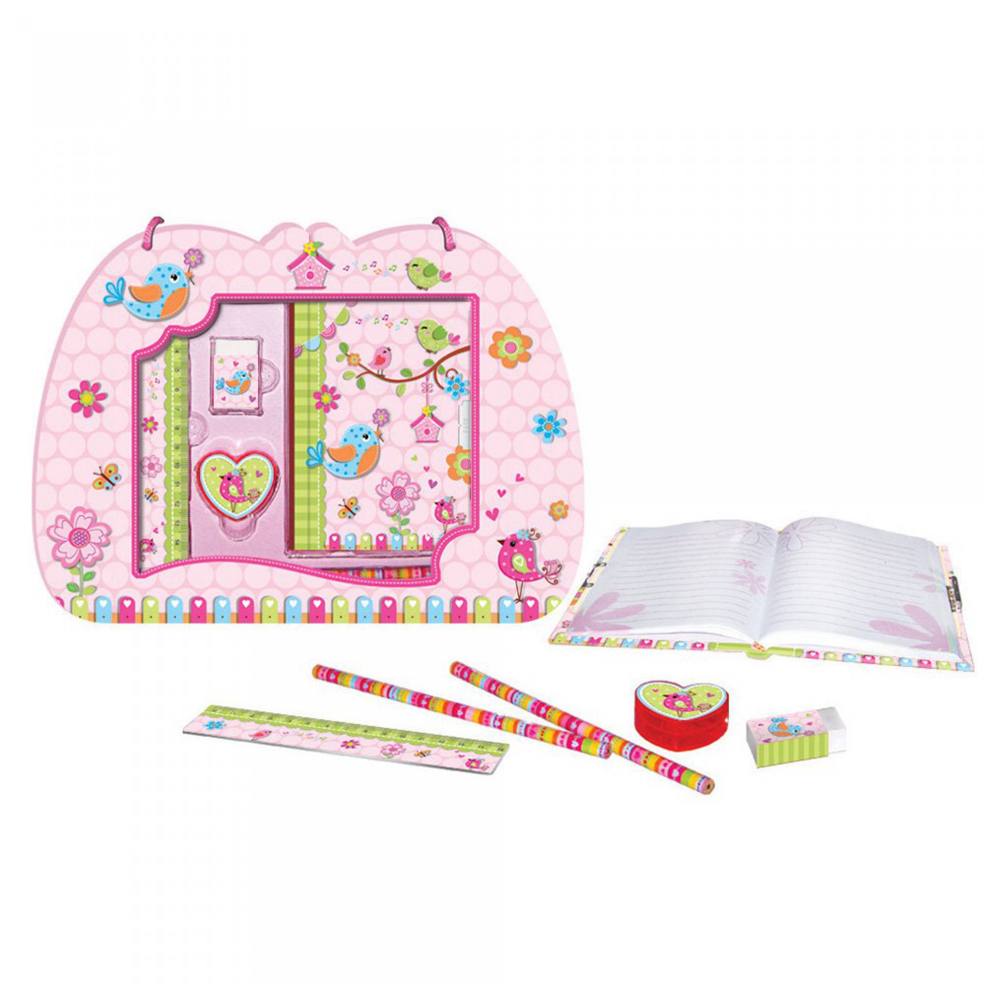 Dárková sada s diářem - ptáčci. Sada obsahuje: diář se zámkem, pravítko, gumu, ořezávátko a 2 tužky.
