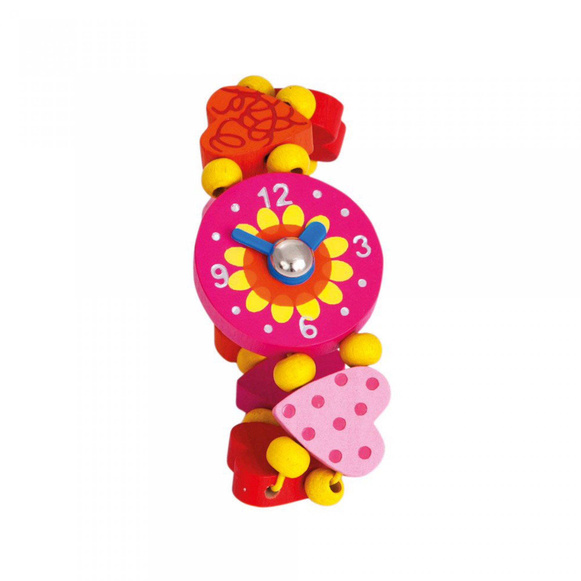 Náramkové hodinky pro malé princezny sestavené ze žlutých dřevěných korálků, růžových a červených srdíček a červeného ciferníčkus posuvnými ručičkami. Díky těmto hodinkám se dítě naučí rozpoznávat čas a navíc udělají spoustu parády.