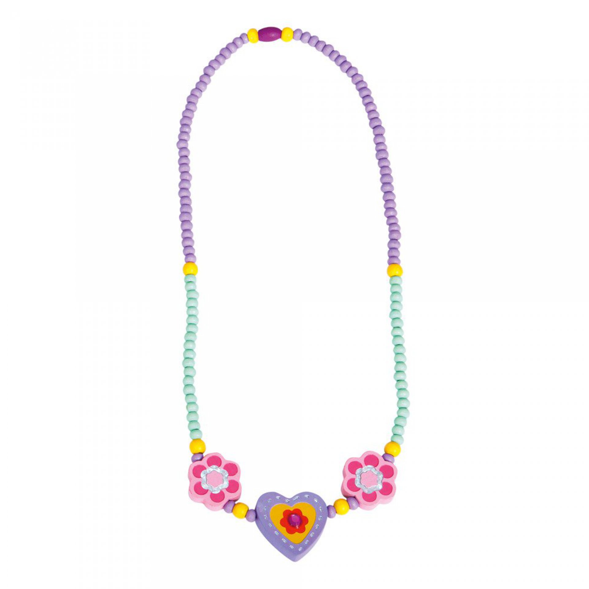 Dřevěný náhrdelník s výrazným fialovým srdíčkem oslní každou milovnici pestrých barev. Kromě srdíčka ověnčete její krček barevnými korálky a dvěma růžovými kytičkami. Krása, která přináší radost.