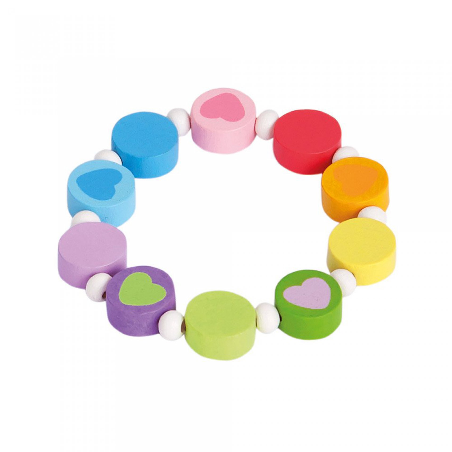 Pestrobarevné dřevěné korálky navlečené na náramek potěší každou malou parádnici. Kulaté korálky v barvě duhy na sobě nosí barevná srdíčka. Hodí se na každou malou ručičku.