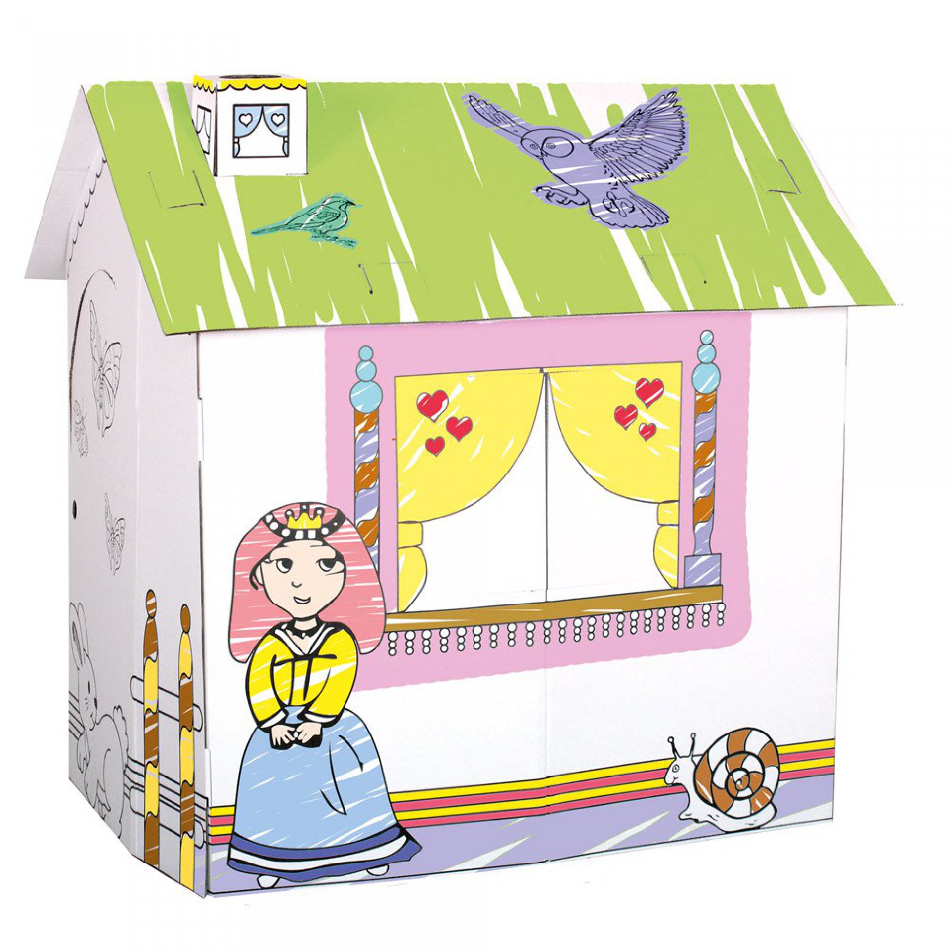 Kartonový domek pro princezny. Skládací-bez podlahy; bez barev; návod na složení; předtištěné motivy na vybarvování na vnějších bílých stěnách. Velikost ca. 88x72x88 cm. Dodávaný rozložený v bílém kartonu s barevným vyobrazením. Na vnitřní použití.
