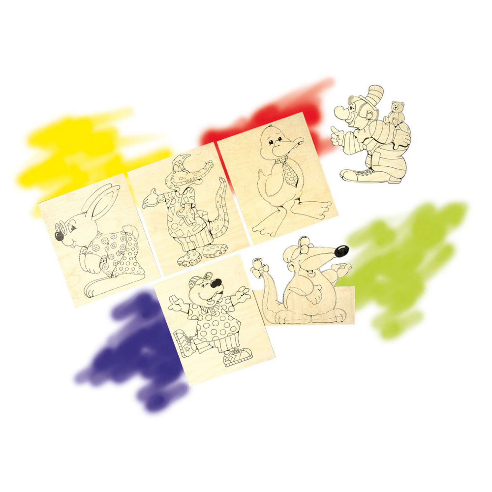 Šest dřevěných desek, každá o rozměrech 25x21,5 cm s nakreslenými předlohami veselých postaviček. Určené k vyřezávání a případnému následnému vybarvení.