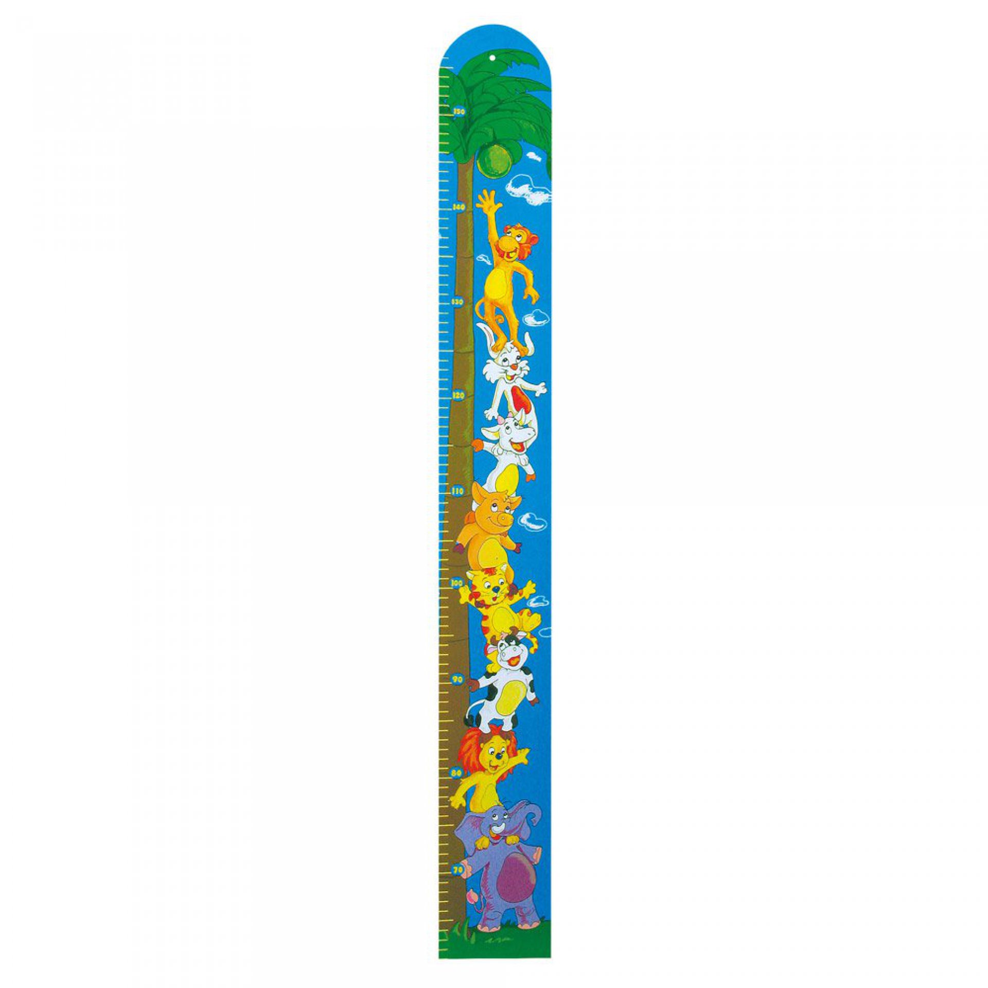 Barevný dřevěný metr se zvířátky z Afriky i ze statku snažící se dosahnout na vrchol palmy. Krásná a užitečná ozdoba dětských pokojíčků.