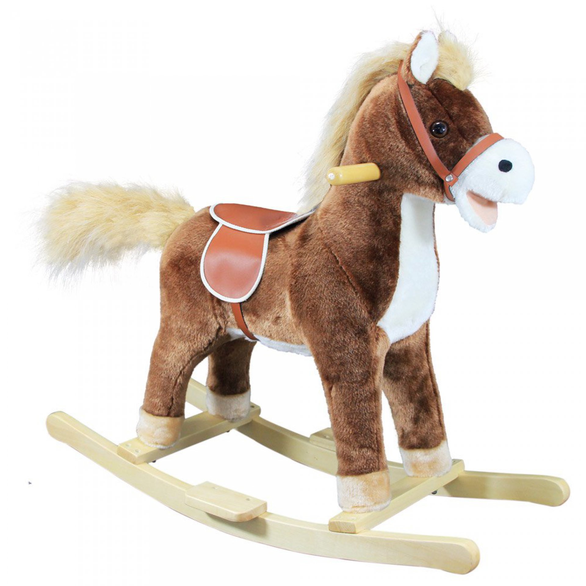 Hnědý houpací koník s bílou náprsenkou je ideální hračkou pro Vaše dítě. Je skoro jako živý – řehtá, dokáže hýbat tlamou a ocásekem a navíc je hebký na dotek.