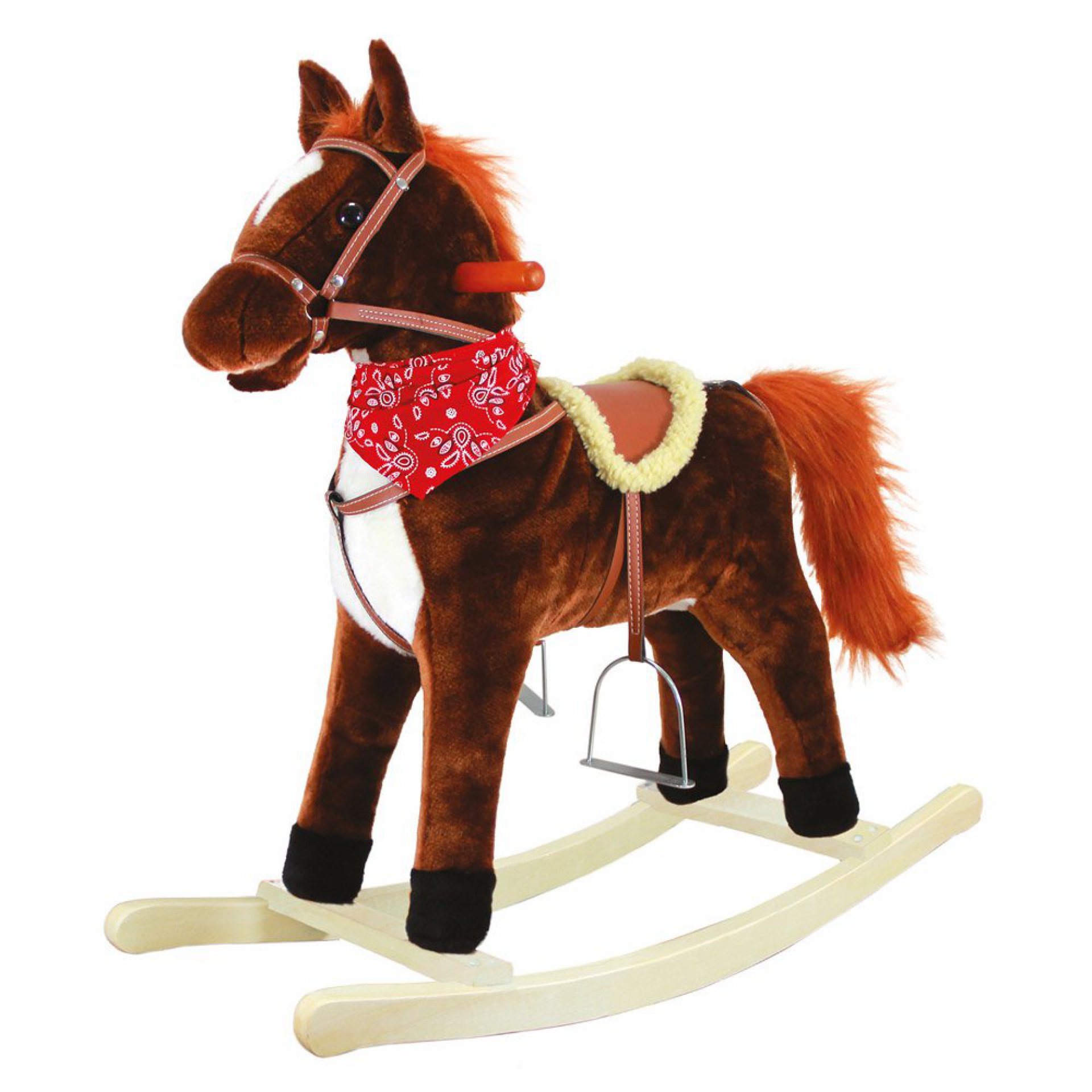 Hnědý houpací koník s bílou náprsenkou je ideální hračkou pro Vaše dítě. Je skoro jako živý – řehtá, dokáže hýbat tlamou a ocásekem a navíc je hebký na dotek.