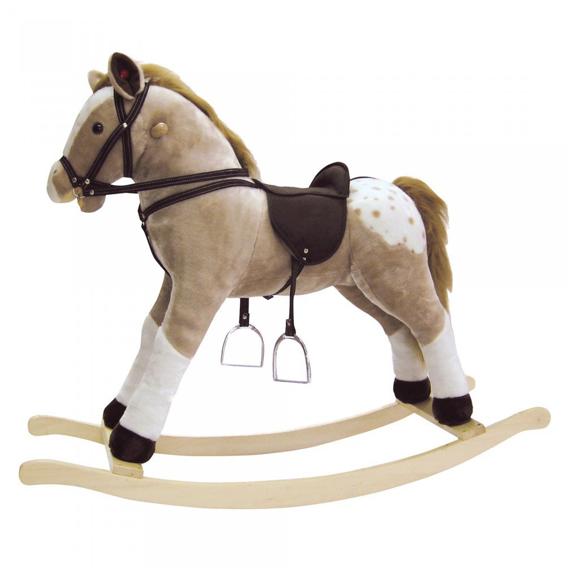 Grošák? Velký houpací kůň plyšový s uzdou a sedlem se třmeny, řehtá a hýbe tlamou. Rozměry: 105 x 32 x 82 cm.