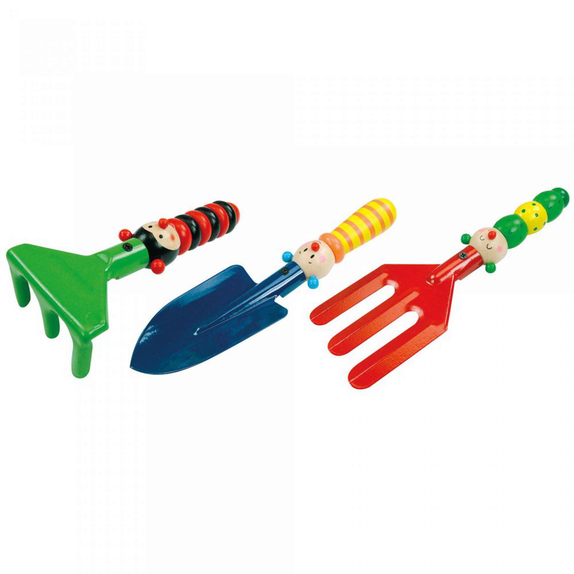 Veselé nářadí pro malé zahradníky. Vezměte děti s sebou na zahrádku, přidělte jim vlastní záhonek a uvidíte, s jakou radostí se budou učit starat se o své rostlinky. Kovová lopatka, hrabičky a kypřící vidlice s dřevěnou rukojetí. 3 kusy.