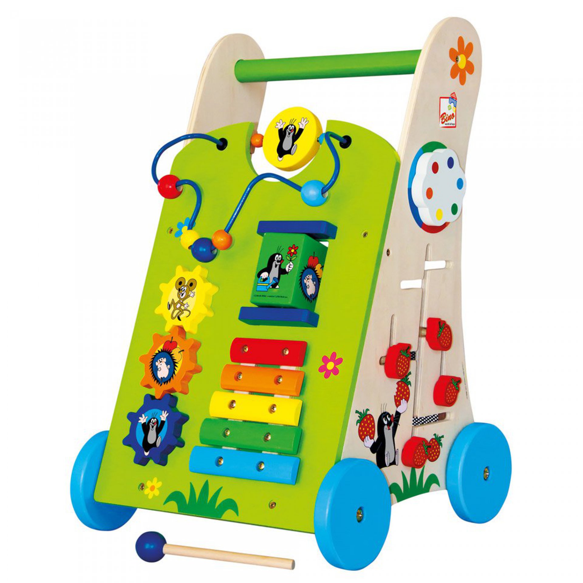 Barevné dřevěné chodítko rozvíjí nejen hrubou a jemnou motoriku, pestrobarevná ozubená kola rozvíjí technické myšlení a barevný xylofon působí na sluchové vnímání. Díky jednoduché provlékačce a labyrintu chodítko posiluje všestranný vývoj.
