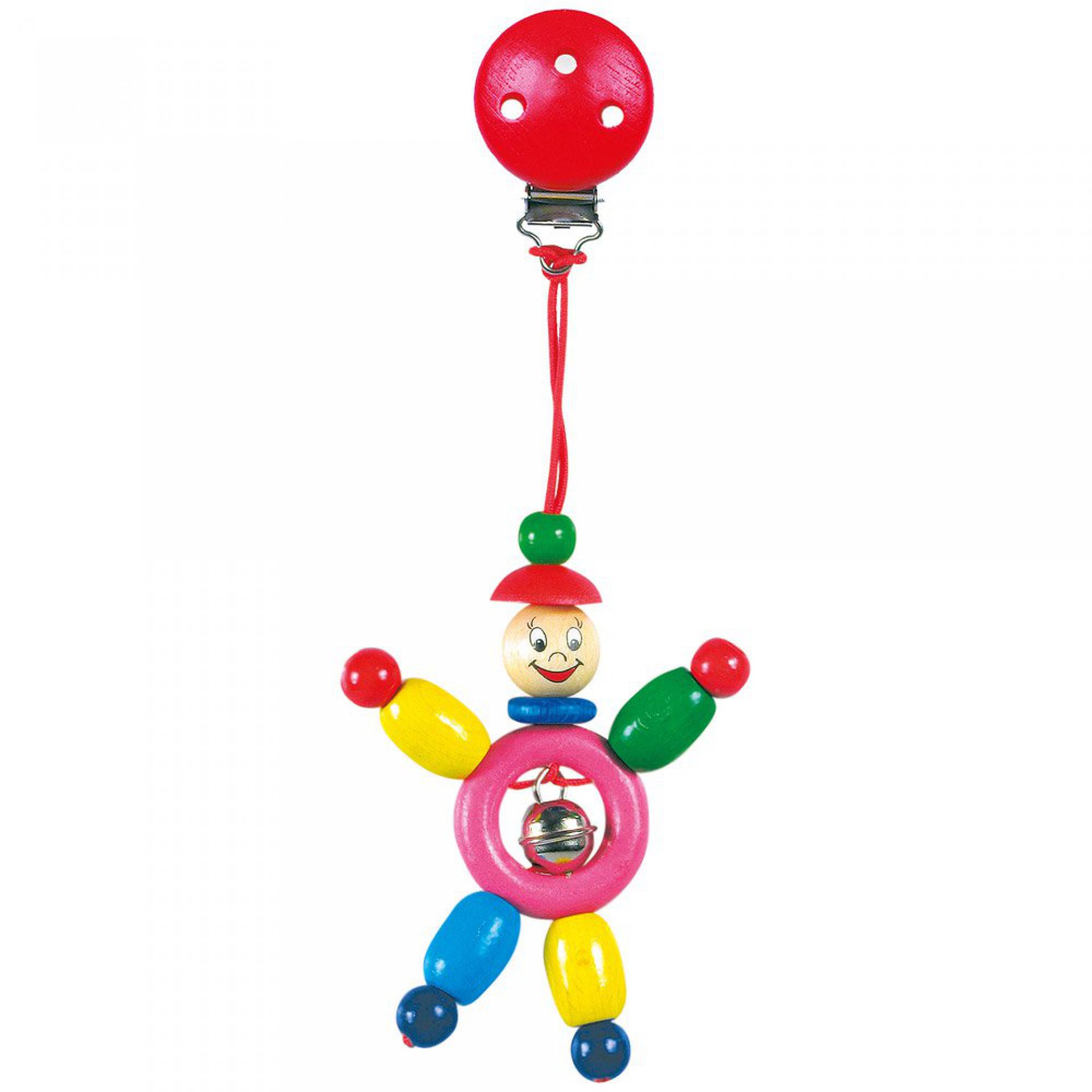 Veselý společník na první cesty v kočárku. Barevná dřevěná figurka má atesty, barvy jsou nezávadné.