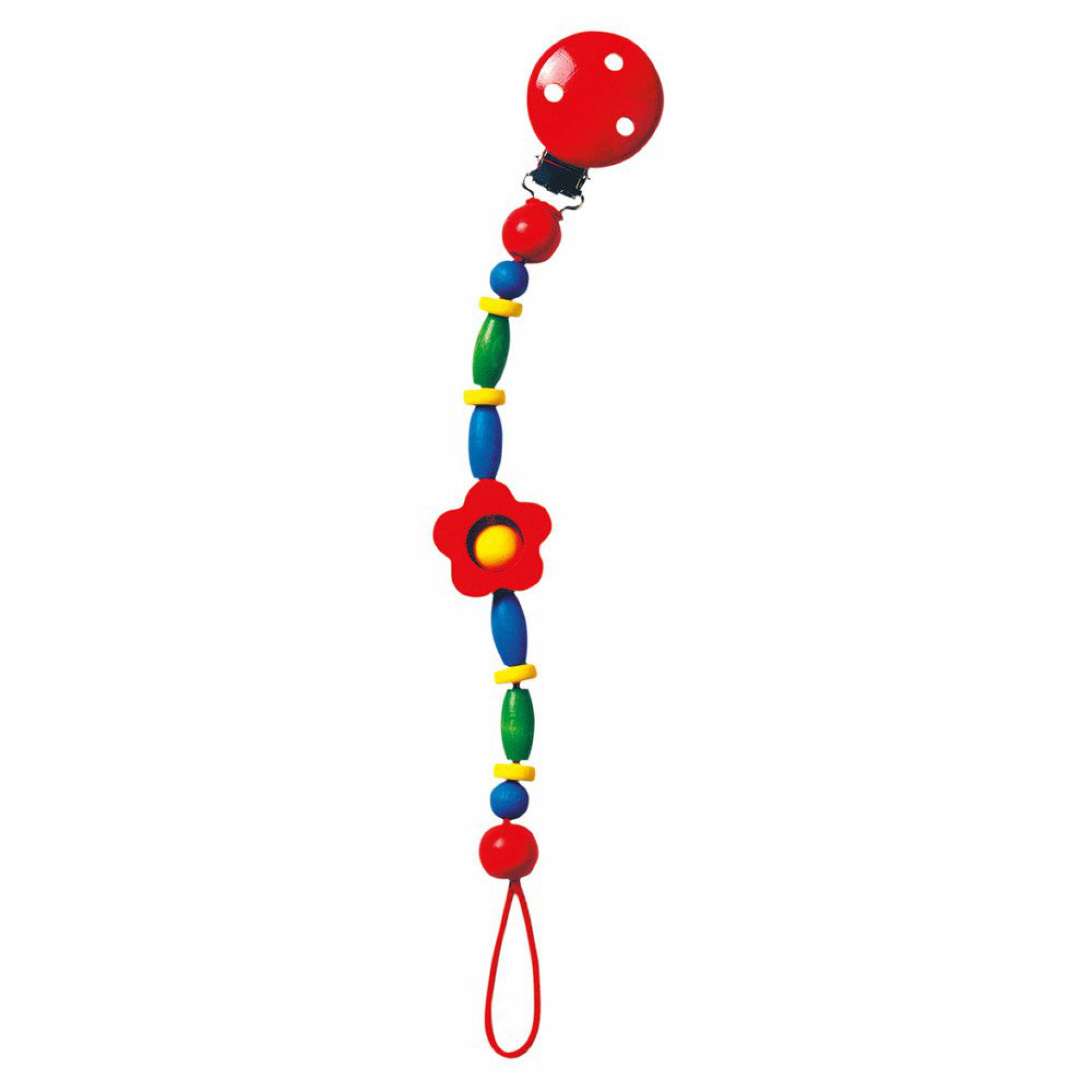 Dřevěná šňura na dudlík s kytičkou. Barvy jsou testované a nezávadné.