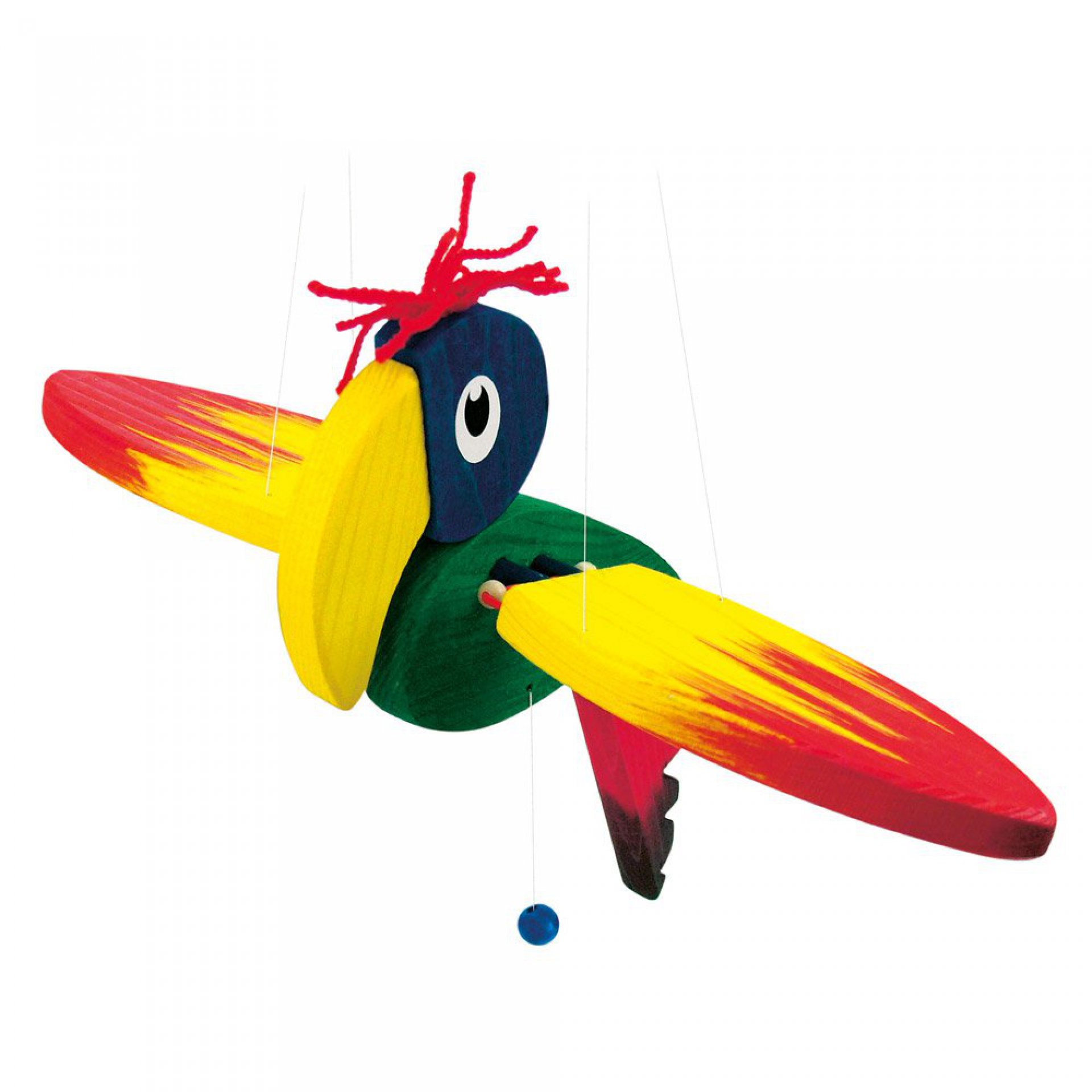 Papoušek na zavěšení. Oživí každý dětský koutek, po zatažení za šňůrku se pohybuje. Rozměry: 54x20x66 cm.