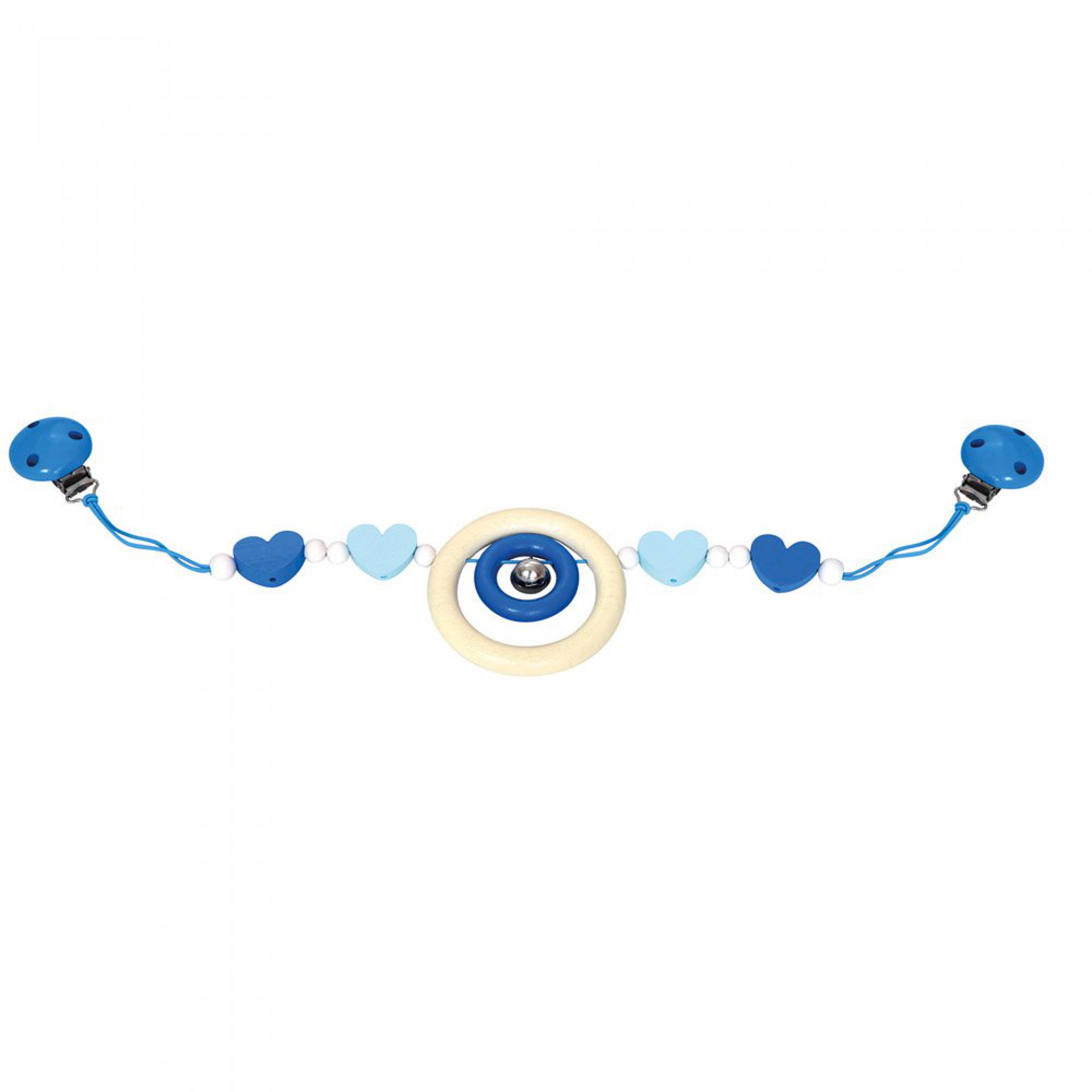 Dřevěný řetěz do kočárku s rolničkou, k podpoře psychomotorického vývoje dítěte. Délka: 59 cm