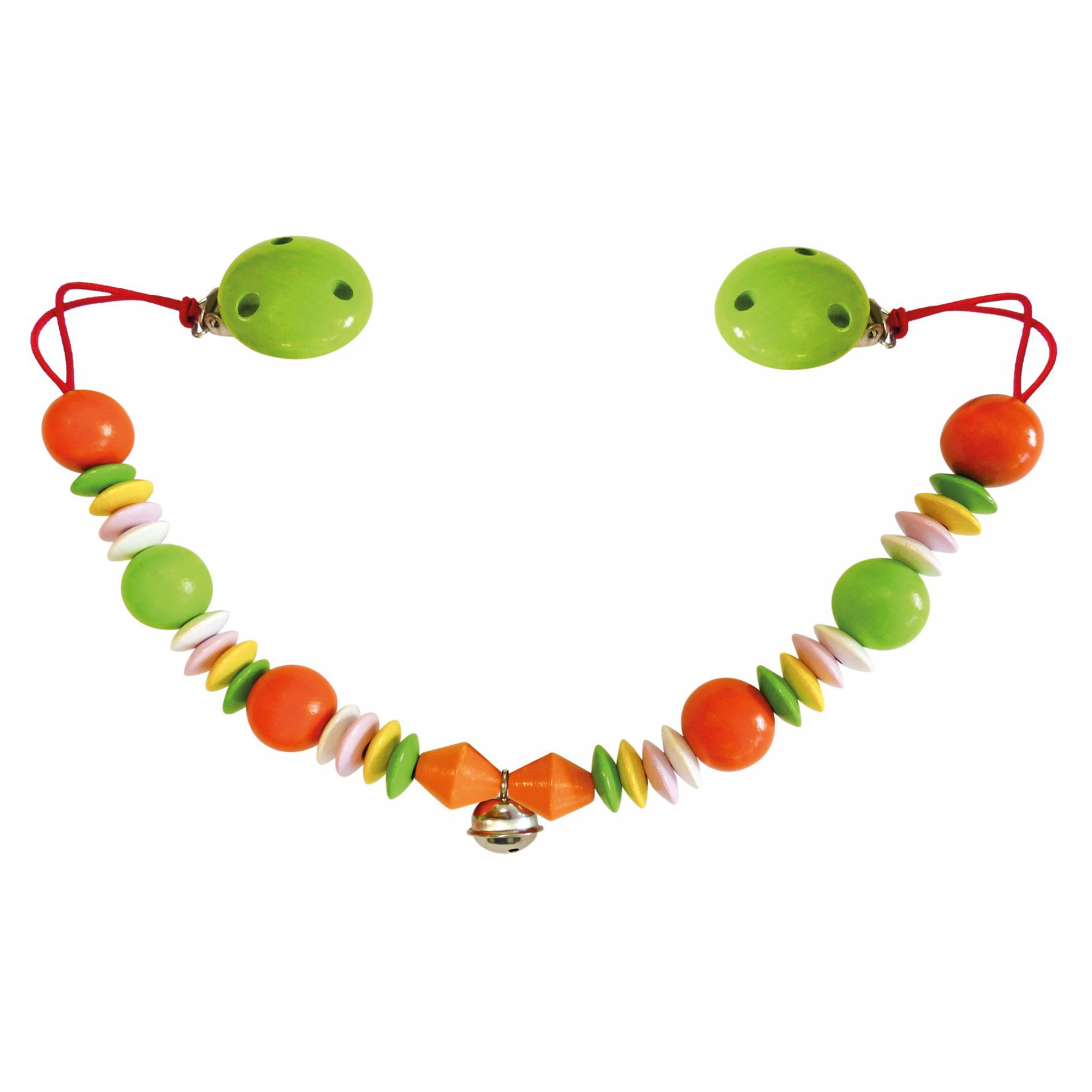 Závěsný řetěz do kočárku s dřevěnými kuličkami, které hrajou veselými barvičkami a cinkající rolničkou uprostřed, bude nejoblíbenějším kouskem vaší výbavičky.