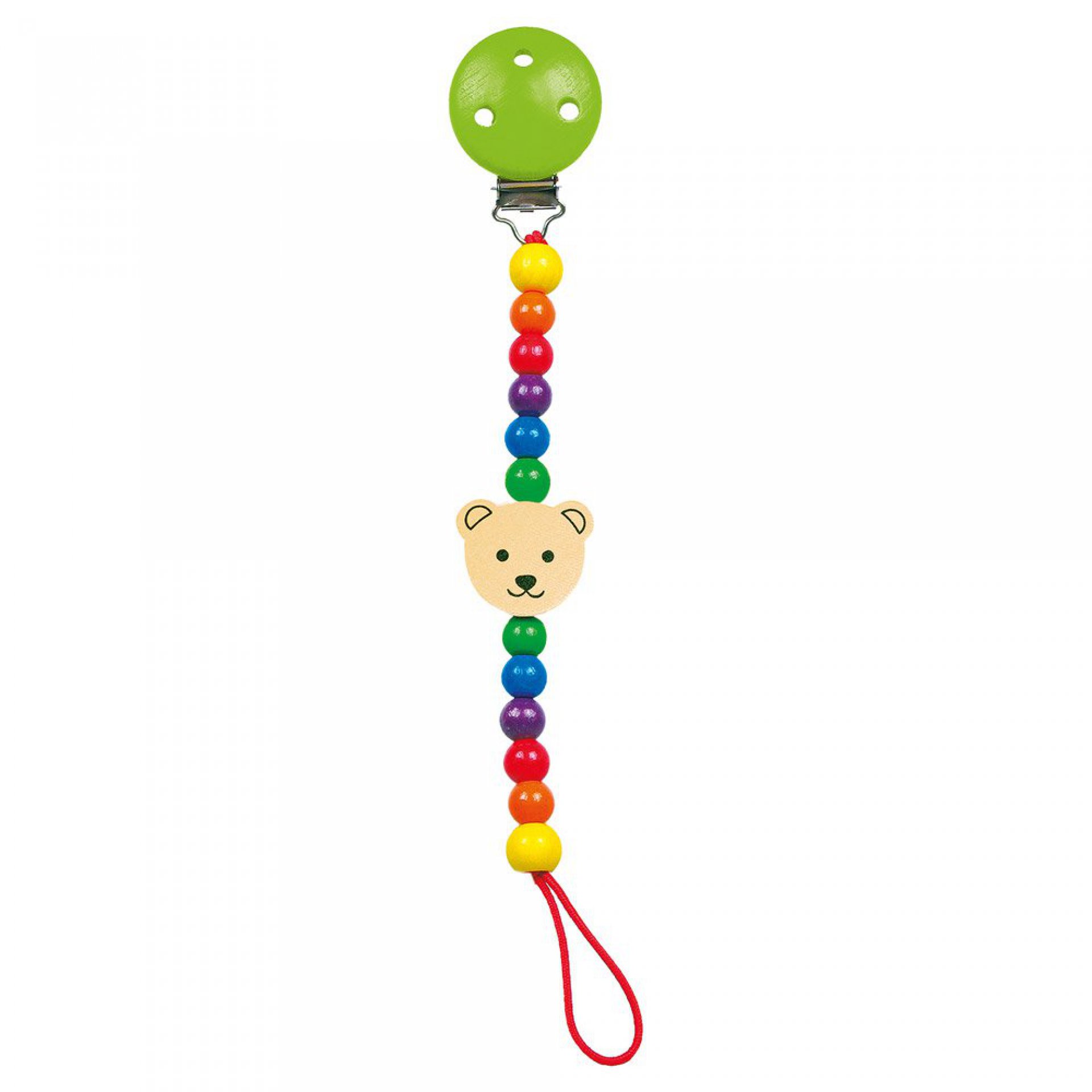Šňůra na dudlík. Dřevěný, pestrobarevný přívěsek na dudlík s medvídkem. První dřevěná hračka našich nejmenších. Barvy jsou testované a nezávadné.Rozměry: 3,5 x 23 cm