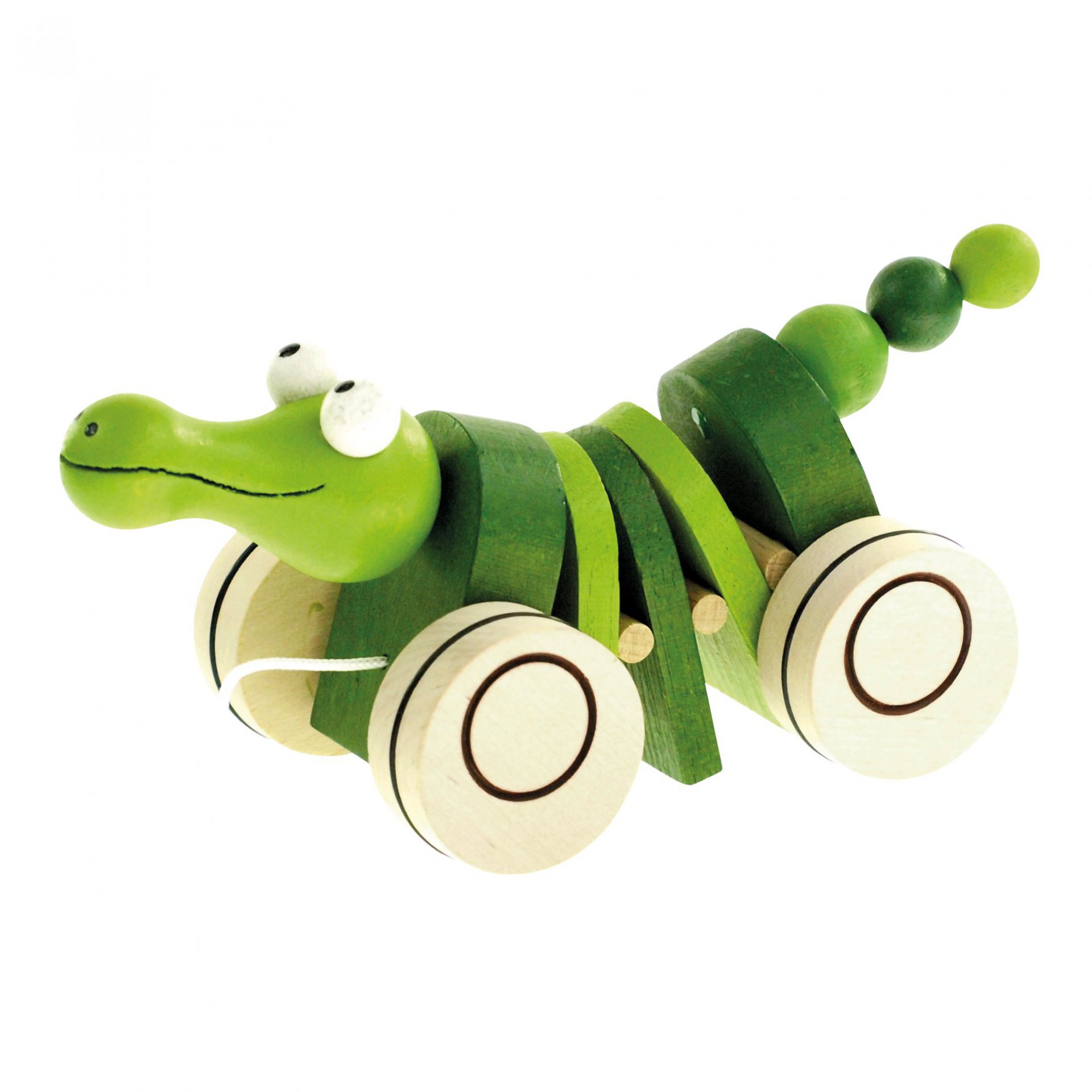 Krokodýl nilský býval nebezpečným predátorem, nyní však může být veselým kamarádem vašeho dítěte. Legrační zelený krokodýl jako dřevěná tahací hračka pojede vždy za vámi. Díky pohybu koleček se celý rozpohybuje.