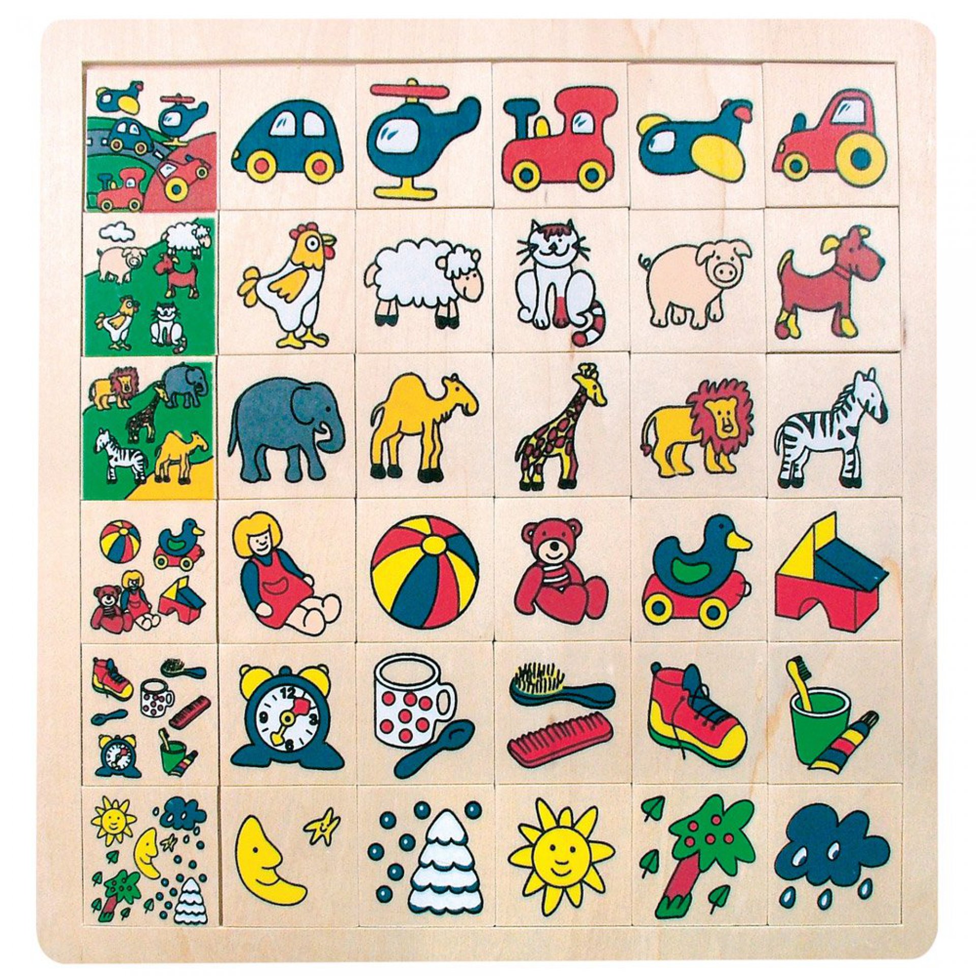 Poznávejme svět s dřevěnou skládačkou co kam patří - které obrázky můžeme zařadit mezi dopravní prostředky, co jsou zvířátka z Afriky a co jsou hračky?