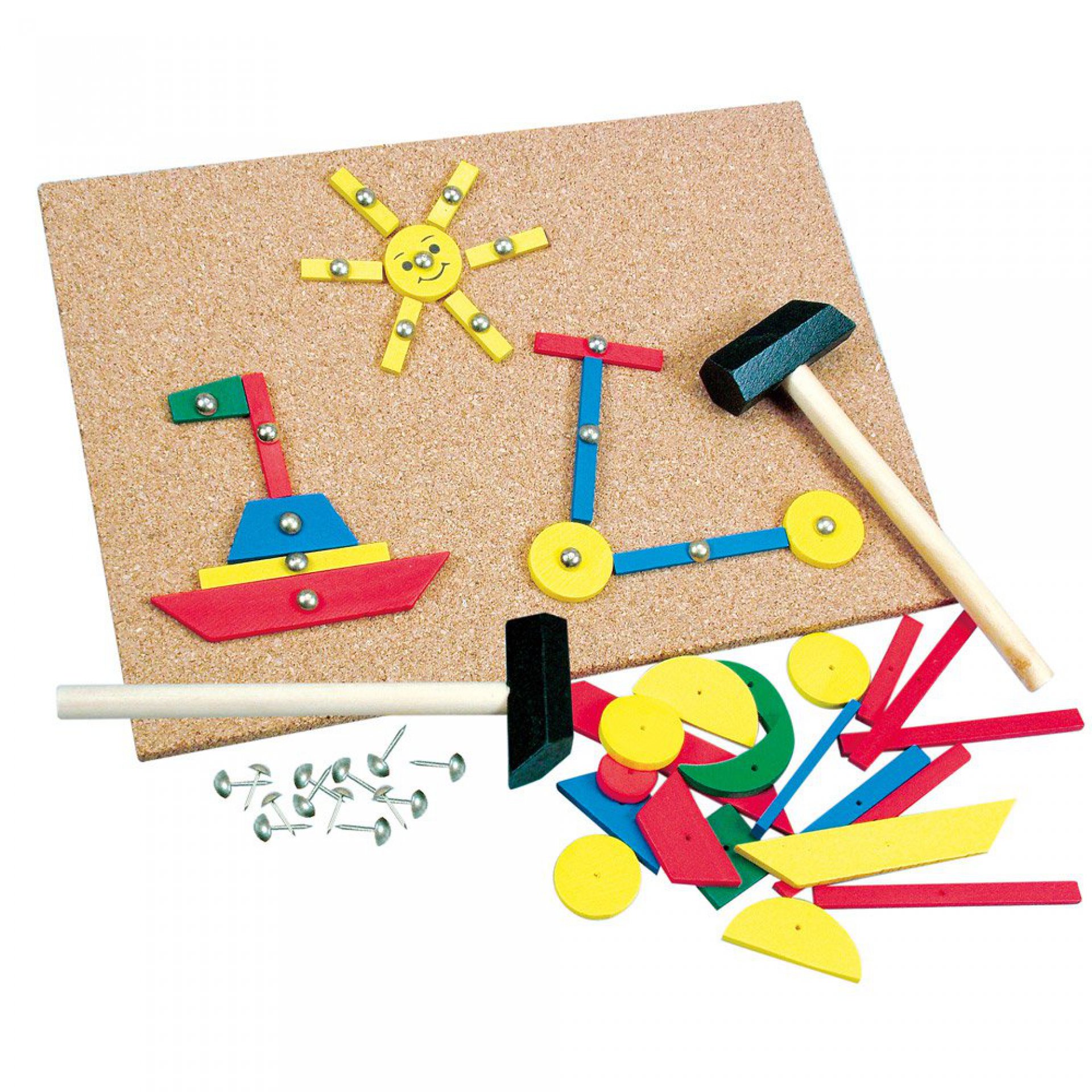 Oblíbená hra s kladívkem podporuje tvořivost a představivost dětí. Z rozmanitých různobarevných dílků lze vytvořit mnoho motivů a pomocí hřebíčků a kladívka je připevnit do korkové podložky. Rozvíjí zručnost a fantazii. Obsahuje 229 dílků.