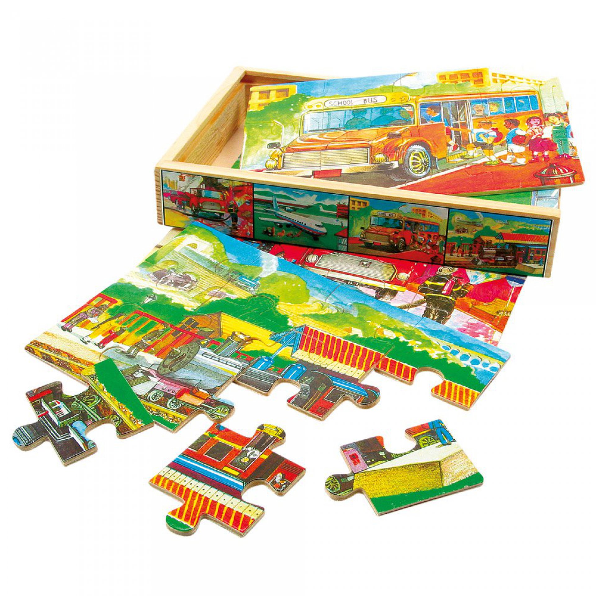 Puzzle pro všechny milovníky aut, vlaků a letadel - čtyři obrázky s tématikou dopravy v dřevěné krabičce.