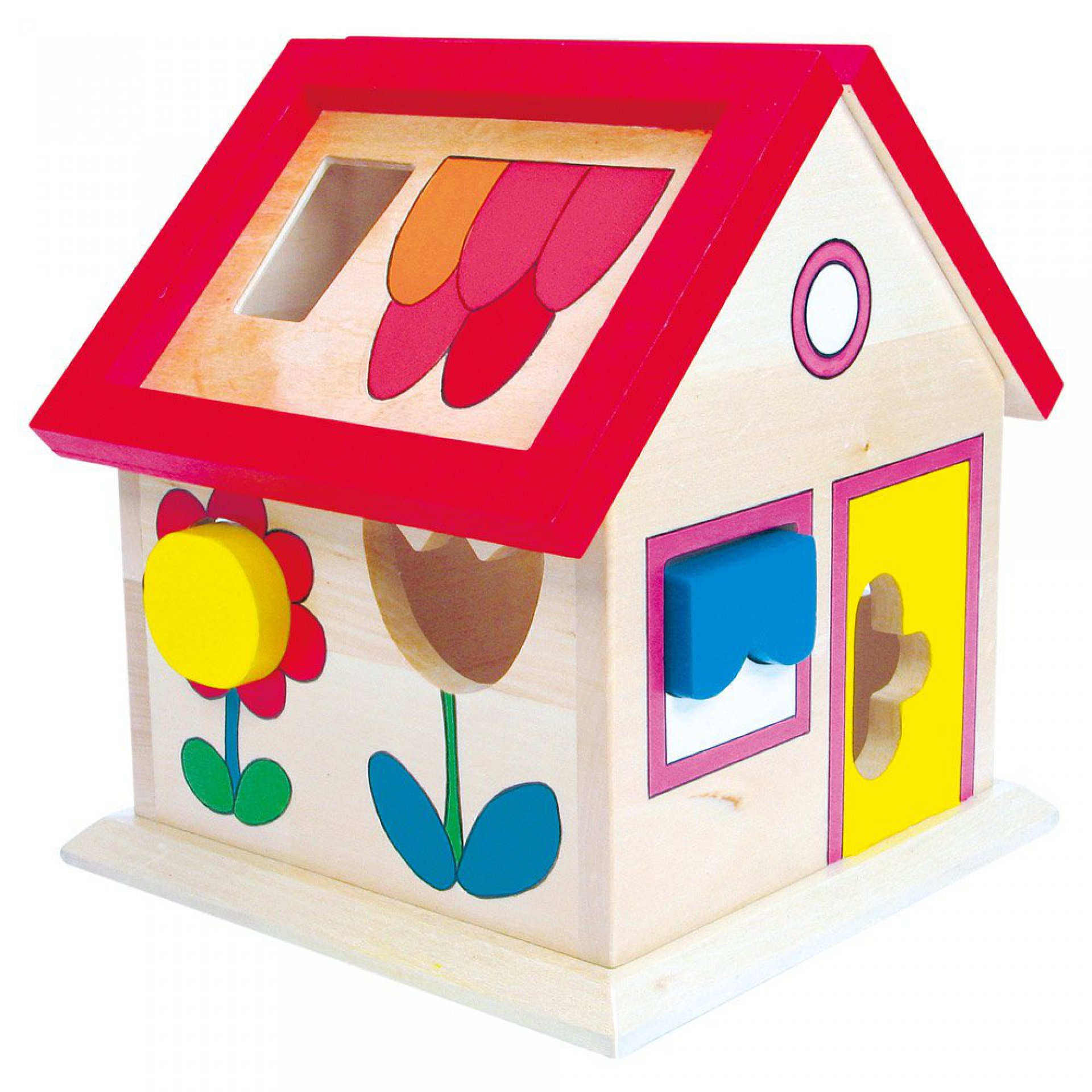 Dřevěný domeček, určený pro vkládání základních tvarů ve veselých barvách. Rozměry: 20x18x21 cm.