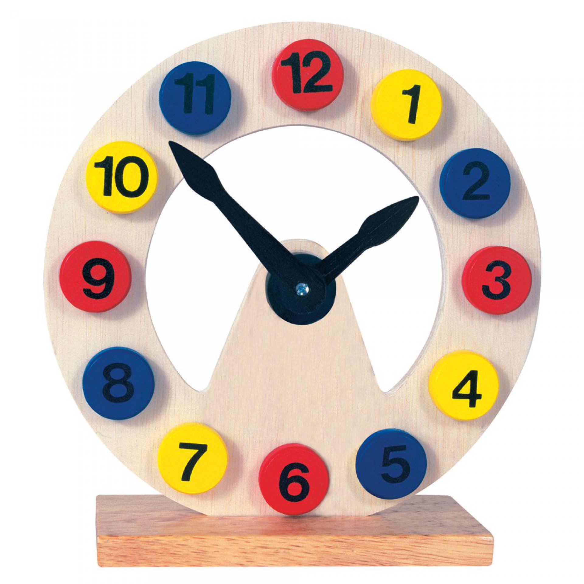 Dřevěné hodiny jsou nejen krásnou dekorací do dětského pokojíčku - vypadají jako opravdické, ale jsou ideální pomůckou pro malé školáky, kteří se právě učí znát hodiny. Jsou upevněny na stabilní podložku a ručičkami lze snadno pohybovat.