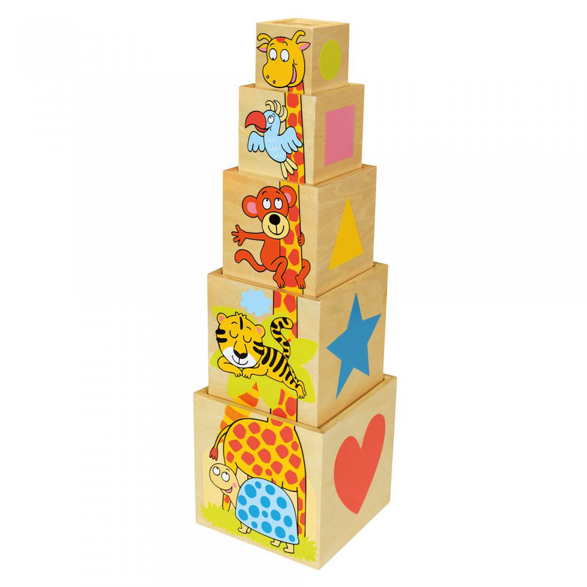 Dřevěné skládací duté kostky, které lze naskládat do sebe nebo stavět na sebe. Na kostkách jsou obrázky zvířat, čísel a symbolů. Na největší kostce je číslo 5 a nakresleno 5 zvířátek, na menší 4 atd. Složené kostky tvoří tělo žirafy.