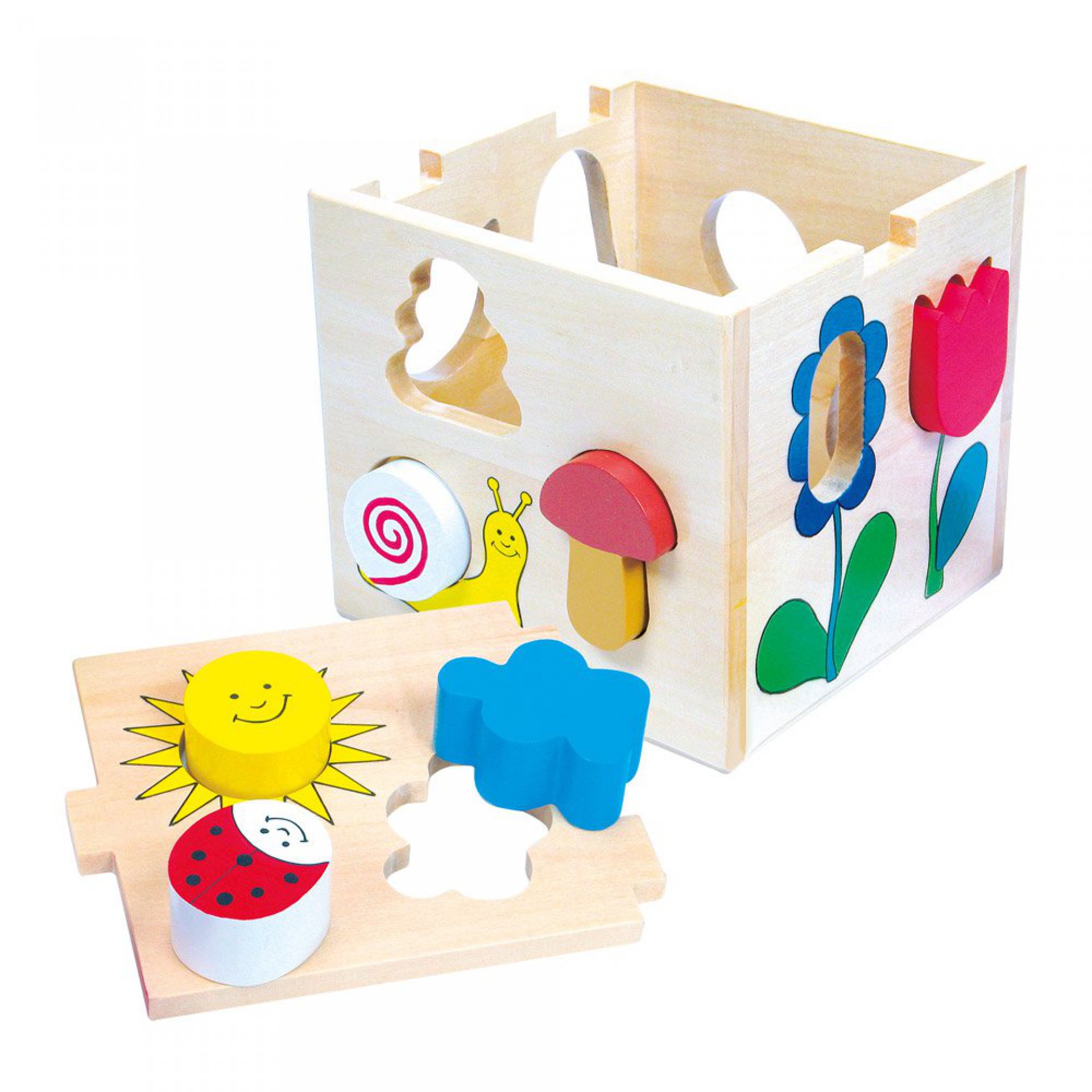 Dřevěná krabička s kytičkami, šnečkem a dalšími tvary z přírody rozvíjí schopnost dítěte kombinovat a podporuje rozvoj motoriky.