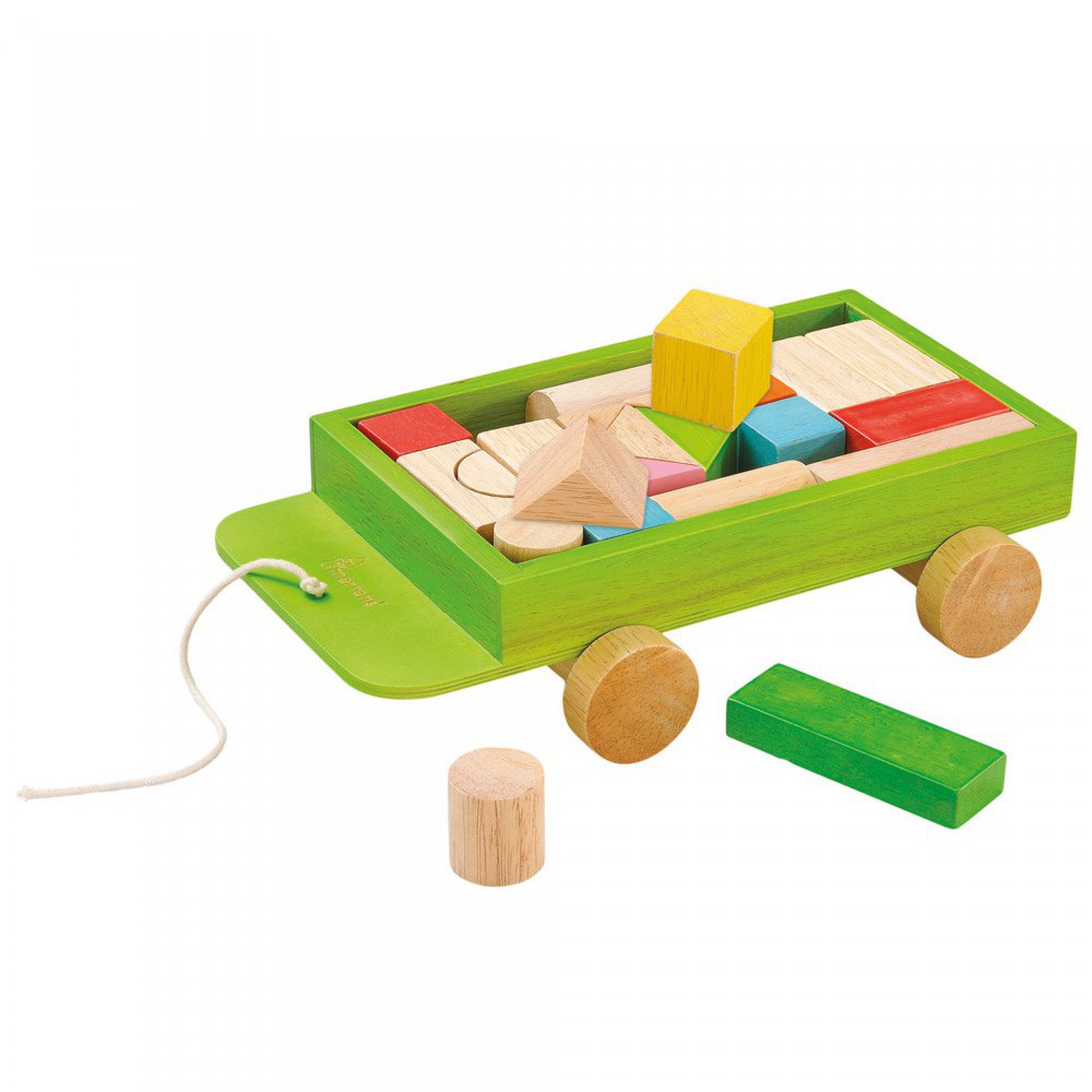 Dobrá zpráva pro všechny malé stavitele! Všechny potřebné kostičky se vejdou na barevný dřevěný vozík na kolečkách. Vozíček je plně naložený 24 ks kostiček.